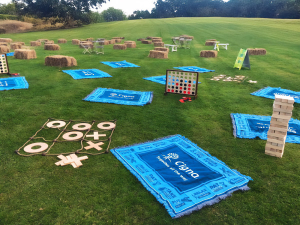 The result? Custom Triple Thread Blankets that added a vibrant and inviting touch to the setup. These weren’t your standard picnic rugs—designed with a bold blue pattern and Cigna branding, they felt fresh, functional, and fun. The blankets complemented the chill-out zone’s relaxed vibe, scattered across the grass amidst bean bags, games, and hay bales.