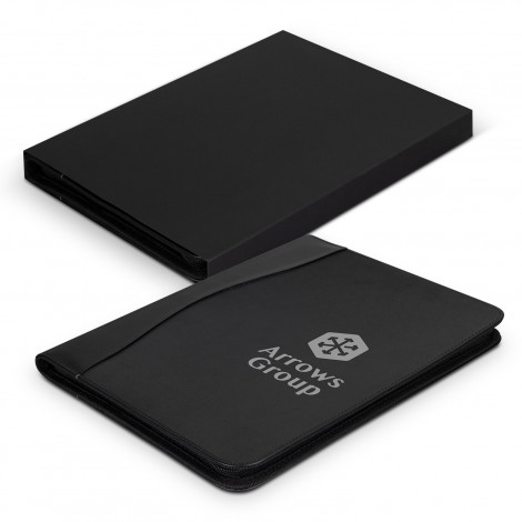 A sophisticated leather portfolio made of bonded leather. It has a zippered closure and a curved front design. A large document slip pocket, A4 lined paper, and internal compartments for a pen, power bank, phone, tablet, and business card are included in the portfolio.