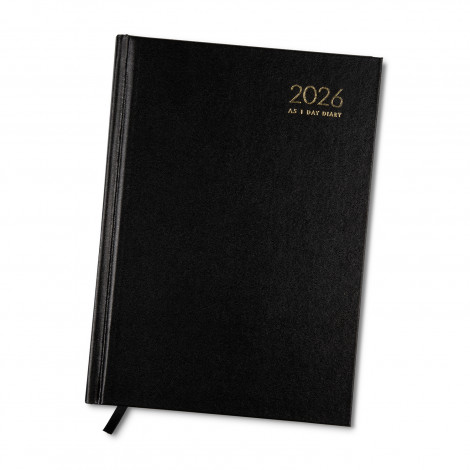 • A5 daily diary with durable black textured hard cover and convenient ribbon marker
