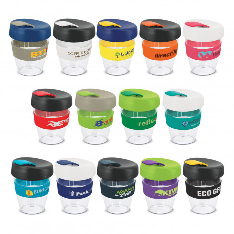 Crystal-clear 350ml reusable coffee cup with a heat-resistant silicone band and a secure screw on lid with a splashproof flip closure. The cup is manufactured from AS plastic and the lid is polypropylene. Both materials are BPA-free. The lid, flip closure and band can be mixed and matched in any colour combination from the standard colours at no extra cost. Up to five different colour combinations are included in the price and more are available for an additional charge. It can be presented in an optional natural gift box on request. This product is not dishwasher safe and handwashing is recommended. Express Cup Claritas is protected under New Zealand Design Registration No. 419451 and Australian Design Registration No. 361937.